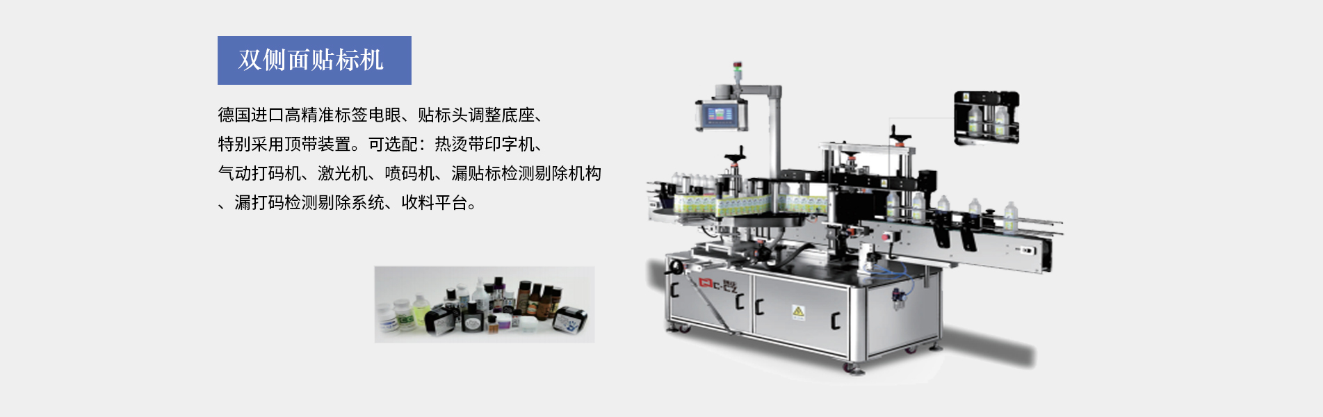本公司生產(chǎn)的口服液貼標(biāo)機(jī)適合細(xì)長(zhǎng)形圓柱體瓶圓周表面的不干膠標(biāo)簽自動(dòng)貼標(biāo),口服液瓶等,采用彩色人機(jī)界面,離合器設(shè)計(jì),使標(biāo)簽張緊力更加穩(wěn)定,便于提高貼標(biāo)精度3、西門(mén)子PLC控制,德國(guó)、日本光眼,高精度步進(jìn),貼標(biāo)速度可達(dá)30米/分鐘,可加裝色帶打碼機(jī)、或者熱轉(zhuǎn)印機(jī)。口服液貼標(biāo)機(jī)多為圓瓶貼標(biāo)機(jī)適用于瓶身長(zhǎng),直徑的產(chǎn)品(玻璃塑料都可以,材質(zhì)不限),同時(shí)可加工粉針劑瓶、采血管、水針劑瓶、眼藥水瓶、圓管等,專門(mén)針對(duì)...